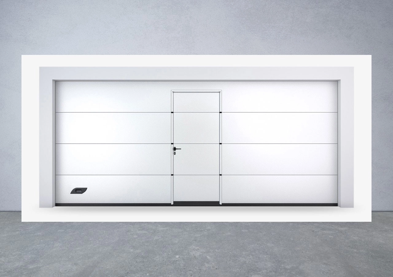 L’utilizzo di pannelli modulo 610 mm. permette, ove lo misure del portone lo consentono, l’inserimento di porte pedonali di altezza superiore ai 1850 mm. (porta pedonale base).