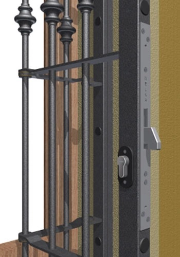 Rinvio di sicurezza: la serratura aziona un rincio a doppio effetto con paletti di sicurezza Ø 14 mm.