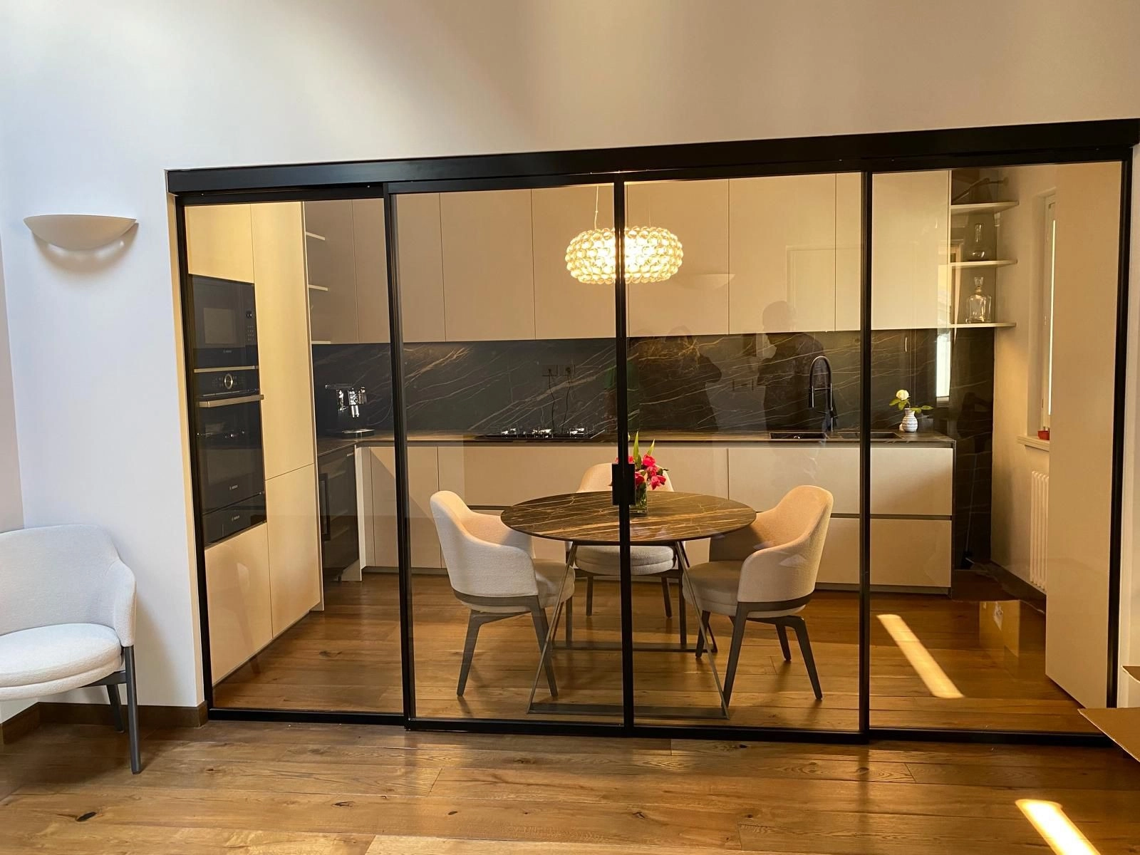 La finitura nera e i vetri extrachiaro creano una divisione elegante che non sacrifica la luce né l'ampiezza visiva, andando invece ad esaltarle al massimo delle possibilità. A porta aperta, i due ambienti si fondono in un unico, grande spazio conviviale.