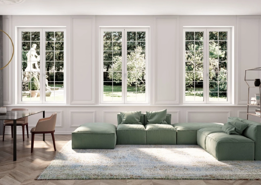 Il profilo sobrio e squadrato racchiude un'eleganza intramontabile, accentuata dalla maniglia esclusiva e dai nuovi fermavetri a 90° che si integrano perfettamente nella struttura definendone le forme.