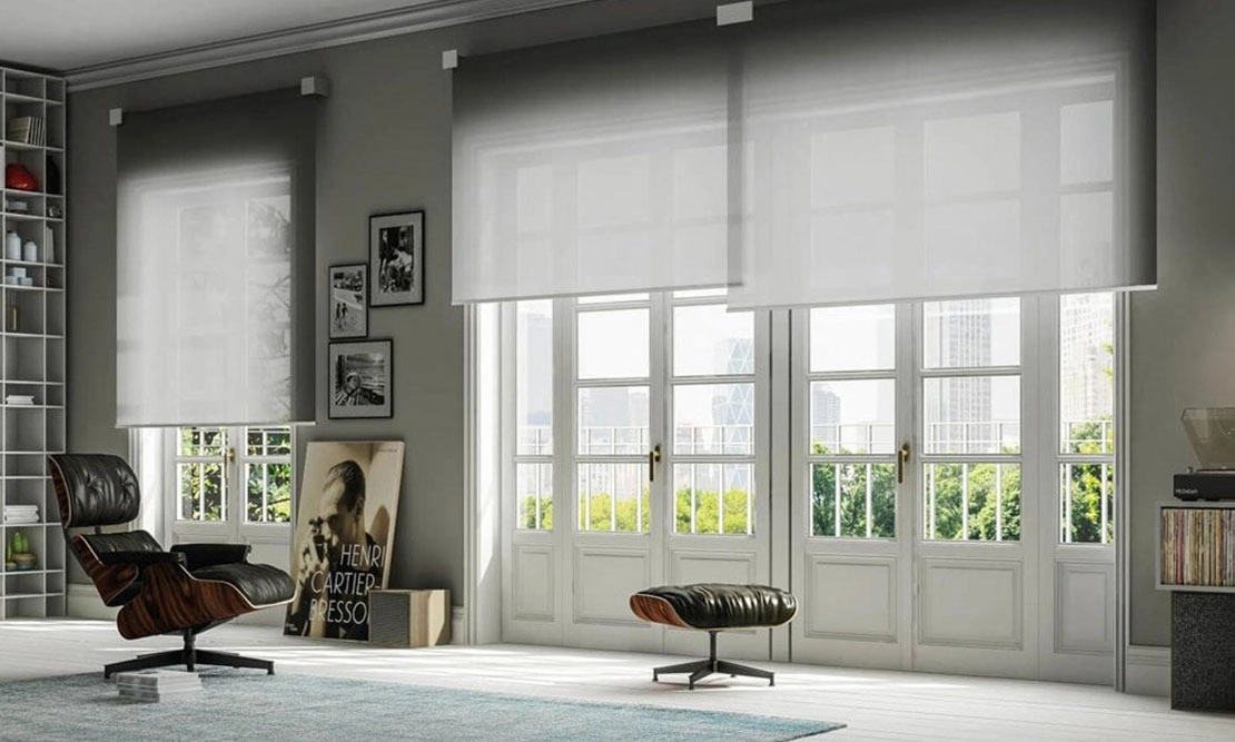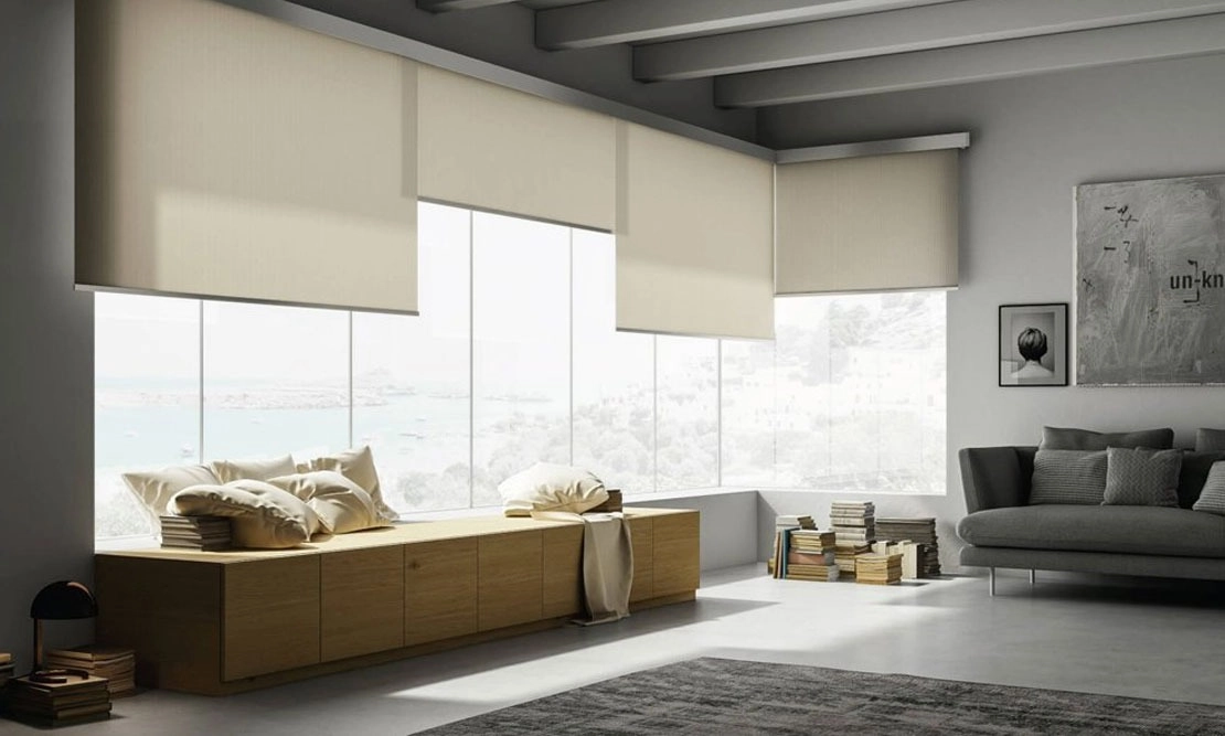 Roll Cinque è una tenda a rullo con movimentazione manuale a catenella e telo singolo, realizzato su misura per superfici vetrate larghe fino a 300 cm.